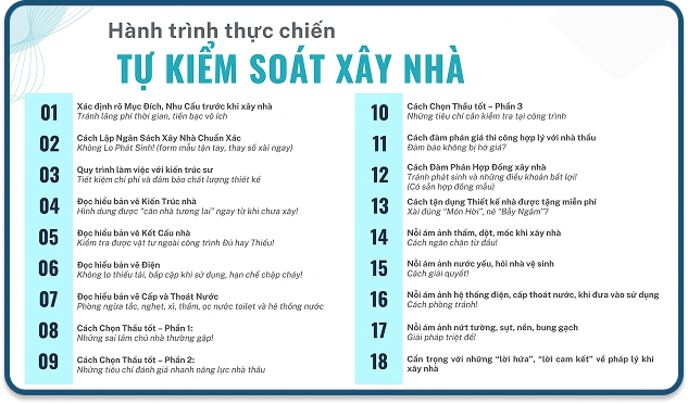 Khoá Học “Tự Kiểm Soát Xây Nhà” online đã hoàn thiện. Chương trình dành riêng cho anh/chị chủ nhà chuẩn bị xây nhà lần đầu, chưa từng có kinh nghiệm, nhưng lại ở xa không thể đến lớp offline.