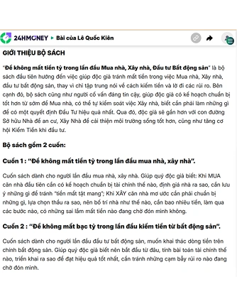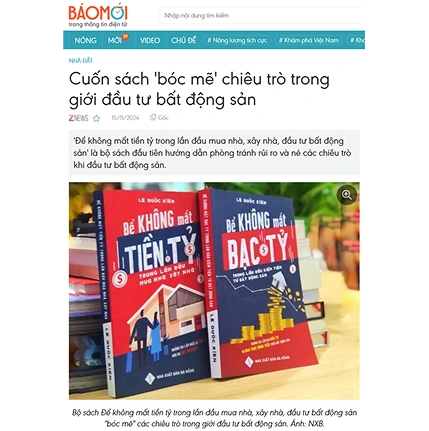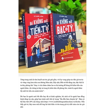 Bộ sách của tác giả Lê Quốc Kiên sẽ giúp bạn tiết kiệm hàng tỷ đồng trong lần đầu tiên MUA NHÀ, XÂY NHÀ, ĐẦU TƯ BẤT ĐỘNG SẢN, và KHAI THÁC DÒNG TIỀN TRÊN BẤT ĐỘNG SẢN, nhờ tránh được những sai lầm từ rất nhiều người đi trước đã trả giá thay bạn.